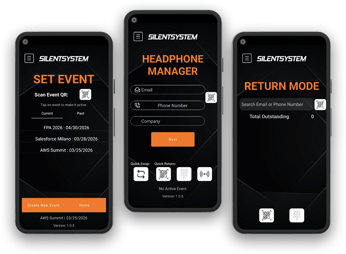 Desde hace más de 15 años, Silentsystem da soporte a eventos silent en toda Europa, proporcionando sistemas de auriculares inalámbricos para fiestas, conferencias, eventos fitness y mucho más. Trabajando codo con codo con organizadores de todos los tamaños, hemos identificado un desafío común: gestionar de forma rápida y segura la distribución de los auriculares durante los eventos. Por eso hemos creado una solución sencilla y concreta. Te presentamos la Silentsystem Headphone Manager App — una app diseñada para agilizar los check-in, asignar auriculares en pocos segundos y mantener bajo control depósitos e inventario. Fácil de usar, rápida y fiable, te permite gestionar todo directamente desde el móvil, sin complicaciones. Está pensada por profesionales del alquiler, para quienes trabajan sobre el terreno y necesitan eficiencia real durante el evento.